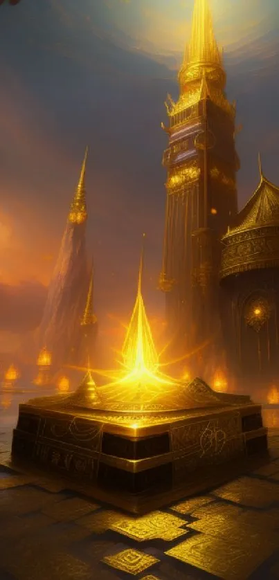 Experience the mystical allure of a golden fantasy castle, illuminated by ethereal light in a captivating scene perfect for mobile backgrounds