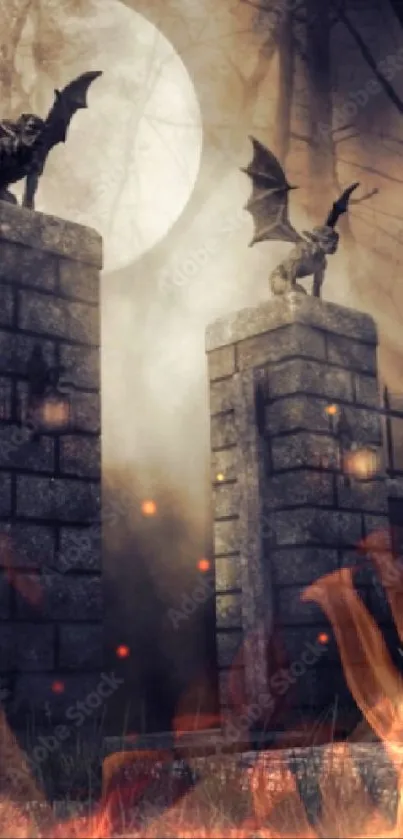 Explore an atmospheric gothic wallpaper featuring moonlit gargoyles on stone pillars, providing a mysterious and eerie aesthetic for your mobile device