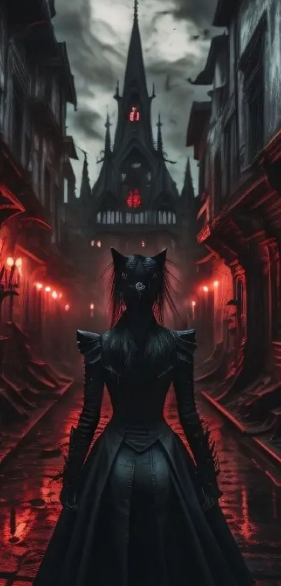 Explore a captivating gothic nightscape with a figure in a dark alley, illuminated by eerie red light, perfect for a dramatic and mysterious mobile wallpaper