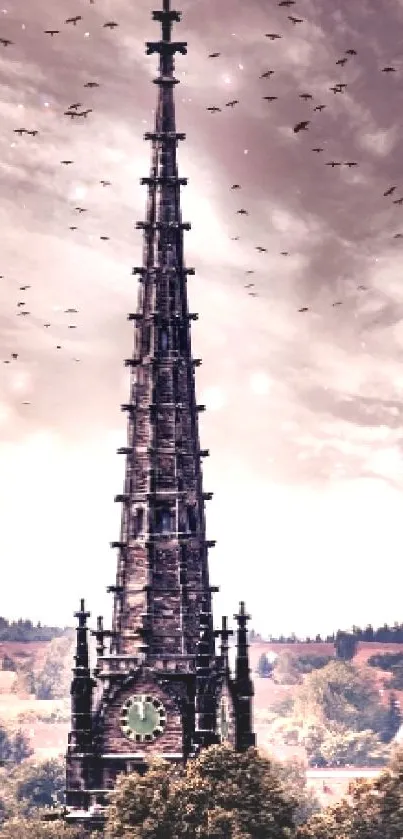 Explore the stunning Gothic spire rising majestically into the sky, surrounded by a dramatic landscape, perfect for enriching your mobile screen with a touch of medieval architecture and moody atmosphere