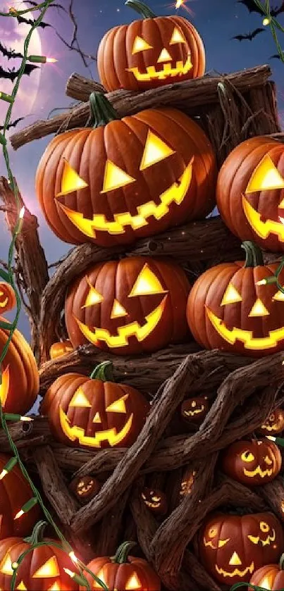 Brighten your screen with a festive tower of glowing Jack-O'-Lanterns in a Halloween night setting, perfect for a spooky celebration vibe