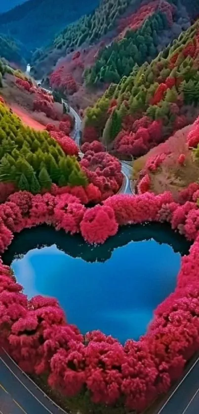 Discover this breathtaking mobile wallpaper featuring a heart-shaped lake surrounded by vibrant pink and green forests, perfect for nature lovers and unique landscape enthusiasts
