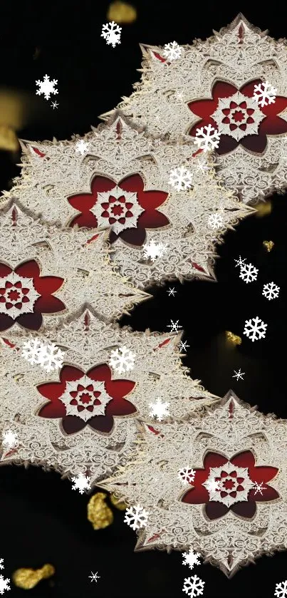 Explore this exquisite mobile wallpaper featuring a detailed floral pattern with elegant snowflakes against a rich black background, perfect for adding a touch of sophistication and charm to your device