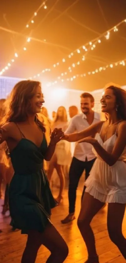 Capture the exhilarating vibe of a joyful evening dance party, showcasing people dancing under warm string lights
