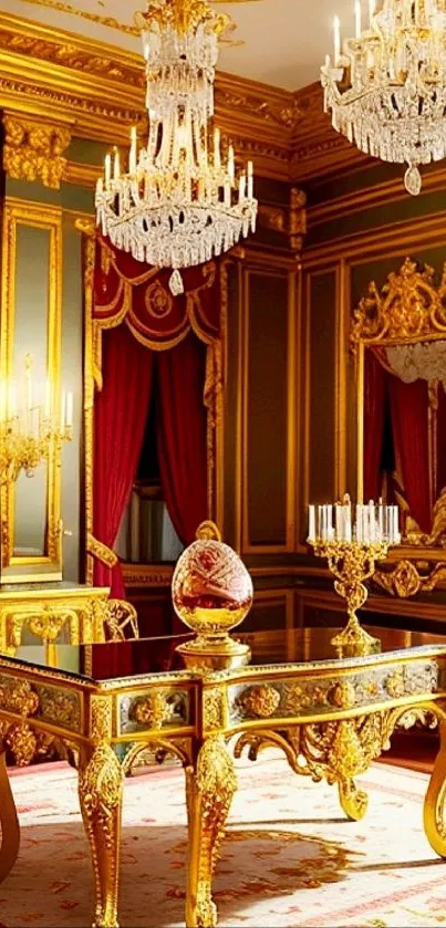 Experience opulence with a luxury royal room wallpaper featuring intricate golden decor and chandeliers