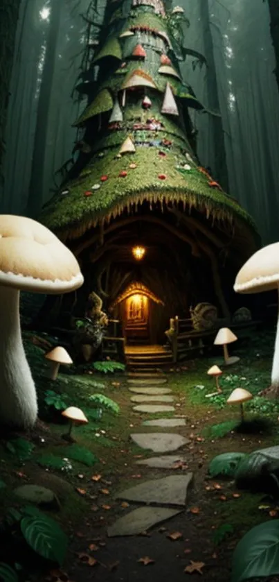 Discover a magical forest setting with a whimsical mushroom house surrounded by towering trees, creating an enchanting and mysterious atmosphere for your mobile wallpaper