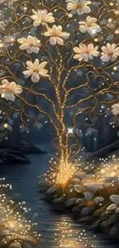 Explore the enchanting beauty of a magical tree by a sparkling stream in this fantasy wallpaper, perfect for adding a touch of whimsy to your mobile device