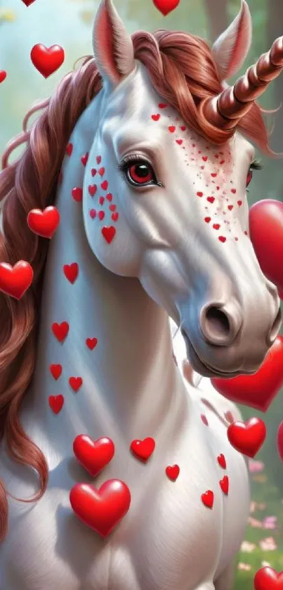 Experience whimsy with a magical unicorn adorned in floating hearts, perfect for fantasy lovers seeking enchanting mobile wallpaper