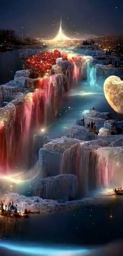 Dive into a mesmerizing fantasy world with this magical waterfall mobile wallpaper, featuring ethereal lighting and a heart-shaped landform, perfect for adding a mystical touch to your phone