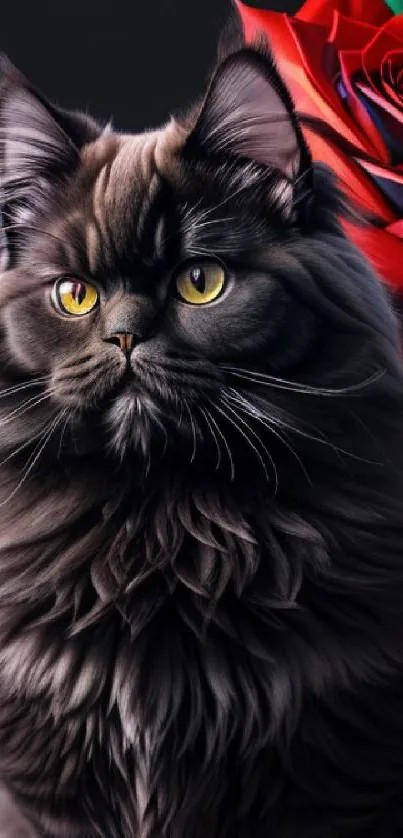 Download this stunning mobile wallpaper featuring a majestic black cat with striking yellow eyes, surrounded by vibrant red roses. Ideal for cat lovers, this beautiful image is perfect for your device's background