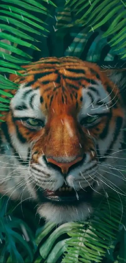 Explore the vibrant jungle with a stunning tiger face-to-face, framed by lush green leaves in this captivating mobile wallpaper