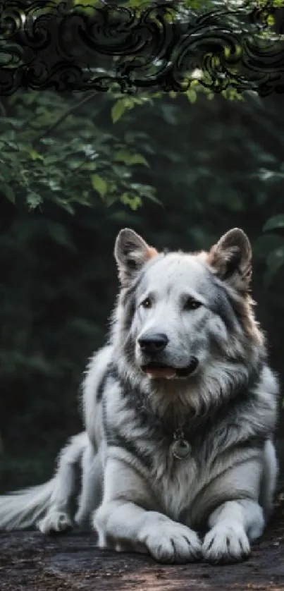 Download this stunning mobile wallpaper featuring a majestic white wolf in a serene forest setting, perfect for nature and wildlife enthusiasts seeking tranquility and beauty for their phones