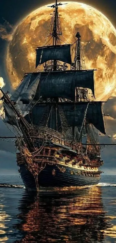 Experience the captivating and mysterious allure of a pirate ship sailing under a glowing full moon in this stunning mobile wallpaper