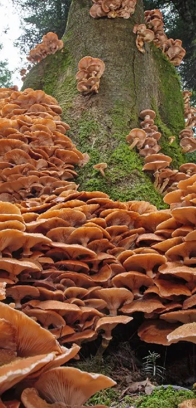 Immerse yourself in nature with this stunning mobile wallpaper featuring a lush forest floor covered with vibrant orange mushrooms against a backdrop of deep green trees, ideal for nature enthusiasts and autumn lovers