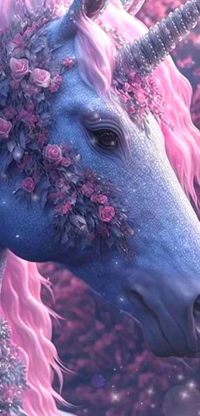Transform your screen with a mystical blue unicorn adorned in pink roses, ideal for fantasy lovers seeking enchanting mobile wallpapers