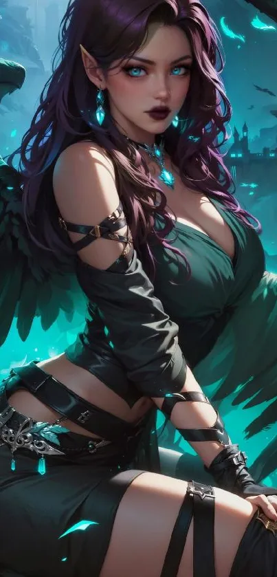 Explore a mystical fantasy world with this intricate mobile wallpaper featuring a captivating winged character against a neon-lit backdrop, providing an enchanting touch to your device