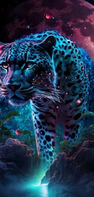 Explore a mystical moonlit scene with a vibrant blue leopard, surrounded by celestial elements in this stunning phone wallpaper