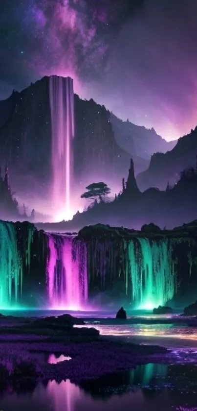 Download this vibrant fantasy waterfall wallpaper, featuring ethereal colors and a mystical landscape, perfect for adding a touch of magic to your mobile phone screen