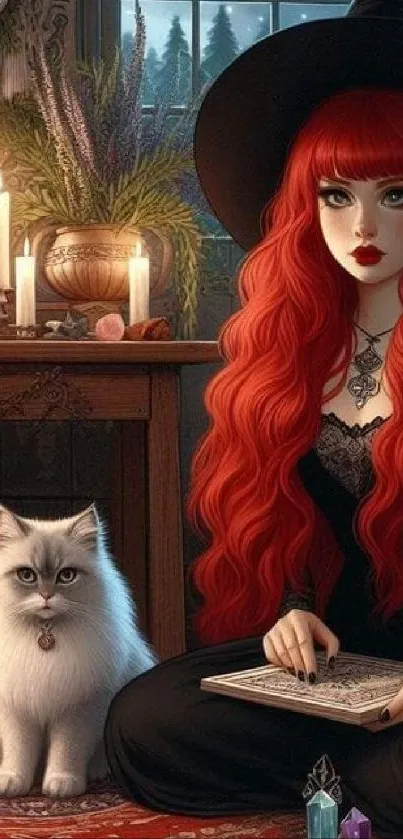 Enchanting digital art of a mystical witch with flowing red hair and a fluffy cat, perfect for phone wallpapers