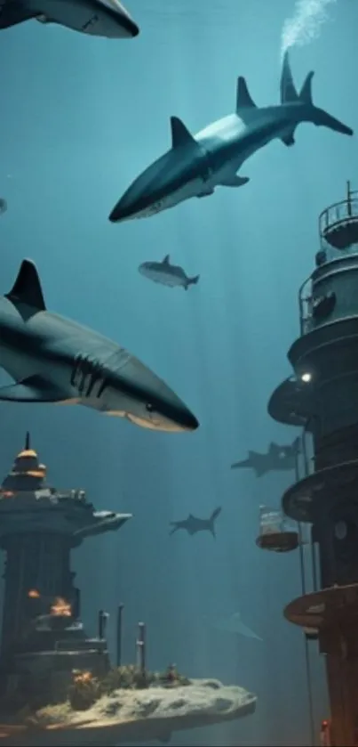Experience the thrill of deep-sea exploration with stunning sharks swimming around ancient underwater structures in this captivating wallpaper
