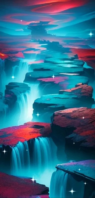 Immerse in a mystical journey with this breathtaking fantasy art wallpaper featuring vivid waterfalls and surreal landscapes, perfect for igniting imagination on your mobile screen