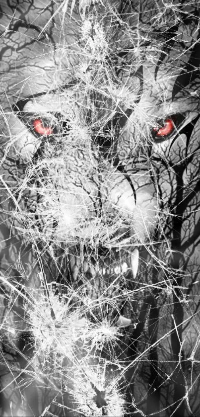 Download this haunting mobile wallpaper featuring a mysterious wolf with piercing red eyes against a dark, tangled forest background. Perfect for adding an eerie and captivating vibe to your phone's home screen