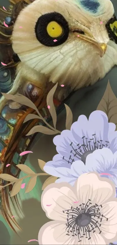 Explore this enchanting mobile wallpaper featuring a mystical owl and delicate floral blossoms, perfect for nature and art lovers seeking a whimsical and serene background