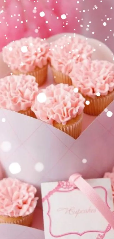 Delight in the elegance of a pink-themed wallpaper featuring beautifully decorated cupcakes in a charming gift box, ideal for adding a touch of sweetness to your mobile screen