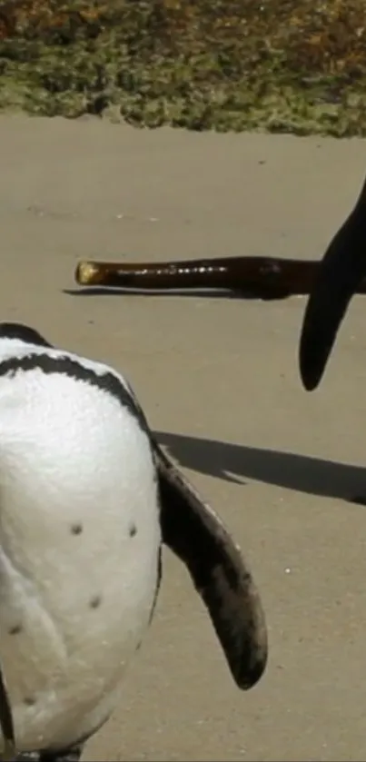 Explore the playful charm of penguins on a sunny beach in this vibrant mobile phone wallpaper, perfect for nature and animal enthusiasts