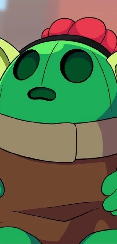 Discover a whimsical green cartoon character with large eyes, set against a vibrant backdrop, perfect for mobile screens