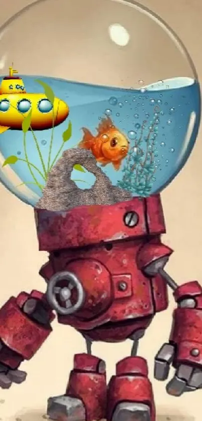 Discover a whimsical robot with a fishbowl head featuring a goldfish and a tiny submarine, perfect for mobile wallpapers