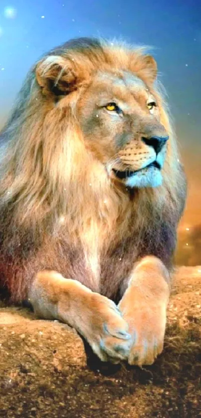 Discover the majesty of nature with this regal lion mobile wallpaper, showcasing the serene beauty of the king of the jungle set against a vibrant sunset sky, perfect for wildlife enthusiasts and nature lovers