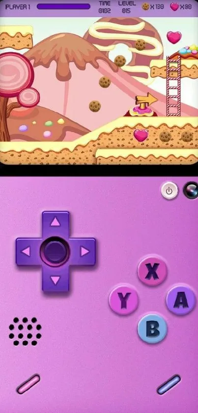 Download this vibrant purple retro gaming wallpaper, featuring a playful nostalgic design with pastel buttons and a vintage game interface, perfect for fans of classic handheld games