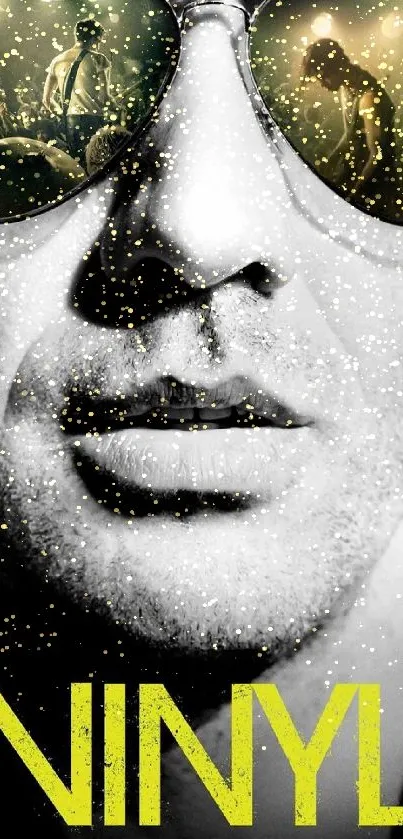 Vibrant rock concert reflected in sunglasses, capturing live music excitement and vinyl nostalgia