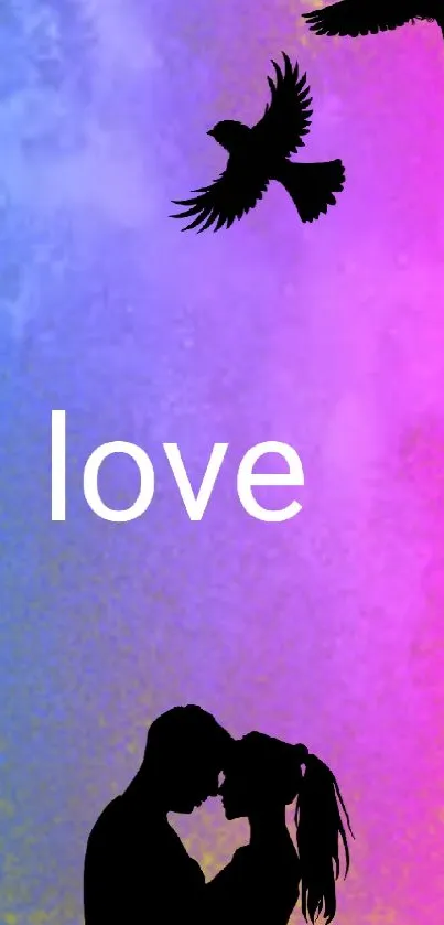 Download this vibrant romantic phone wallpaper featuring a berry background with the word 'love' and silhouettes, perfect for brightening your screen