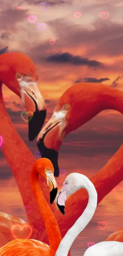 Immerse in stunning romance with flamingos forming a heart against a vibrant sunset sky, perfect for your mobile wallpaper