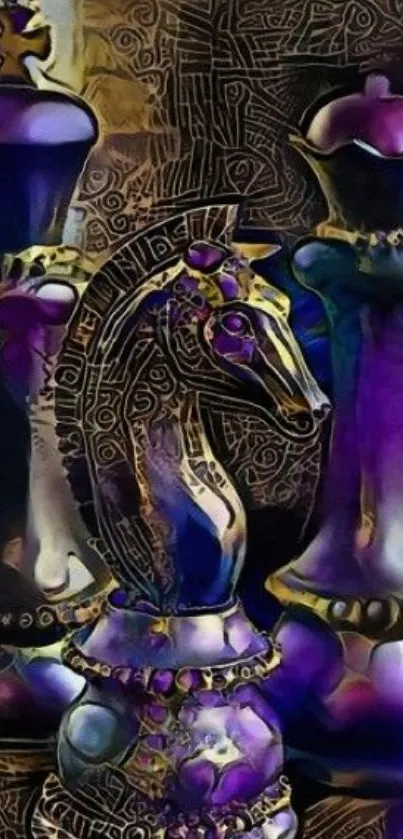Download this stunning mobile wallpaper featuring intricately designed chess pieces with vibrant purple and gold hues, embodying an artistic and regal theme perfect for chess enthusiasts and art lovers