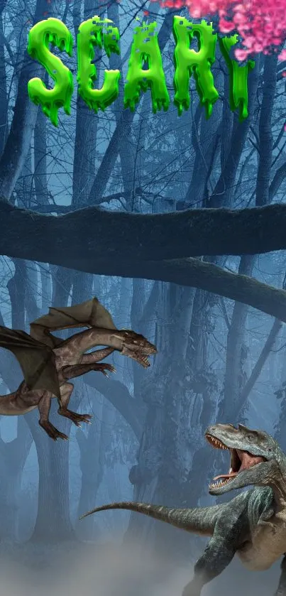 Experience the thrill with a spooky forest wallpaper, featuring a dragon and dinosaur for a truly eerie vibe. Perfect for those who love mysterious and adventurous themes