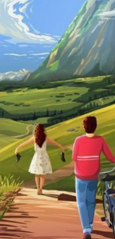 Explore a picturesque landscape with a couple walking toward a majestic mountain, perfect for nature lovers' mobile backgrounds