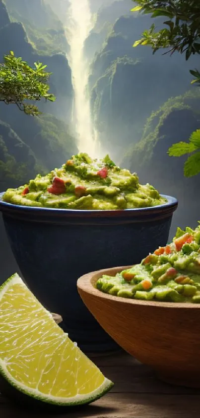 Discover the perfect blend of nature's tranquility and culinary delight with vibrant guacamole set against a serene waterfall landscape backdrop, ideal for food and nature enthusiasts alike