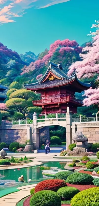 Explore tranquility with this beautiful Japanese garden wallpaper featuring cherry blossoms and traditional architecture, perfect for creating a peaceful mobile backdrop