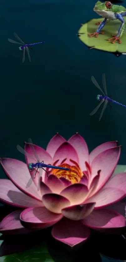Experience serenity with this mobile wallpaper featuring a blooming lotus, vibrant dragonflies, and a tranquil frog, creating a serene and vibrant natural scene for your device screen