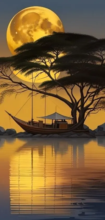 Experience tranquility with this serene mobile wallpaper featuring a boat under a full moon reflecting on calm waters, perfect for nature and night sky lovers