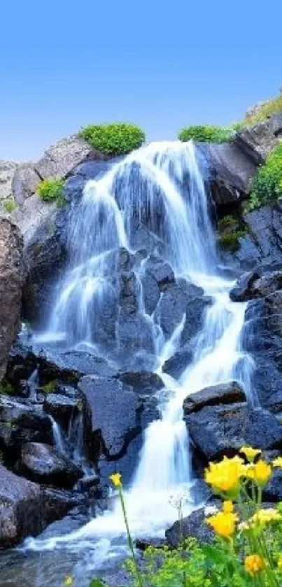 Experience tranquility with this mobile wallpaper showcasing a serene waterfall cascading over rocks, surrounded by vibrant yellow flowers and lush greenery under a clear blue sky