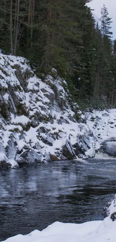 Experience tranquility with this serene winter river scene, showcasing snowy banks and cascading waters