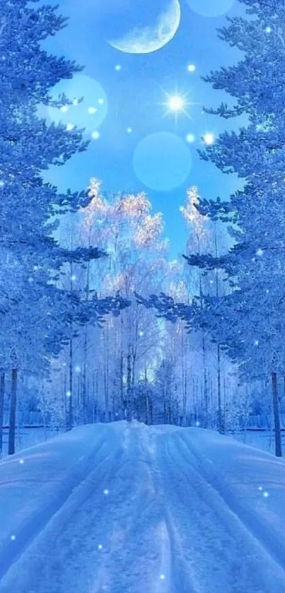 Transform your phone with a serene winter wonderland wallpaper featuring a snowy path under a moonlit sky, ideal for nature lovers and those seeking peaceful scenery