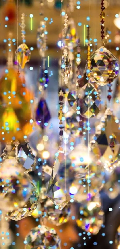 Download this sparkling crystal wonderland mobile wallpaper, featuring hanging glass ornaments that shimmer with colorful reflections against a softly blurred background, perfect for adding a touch of elegance to your phone