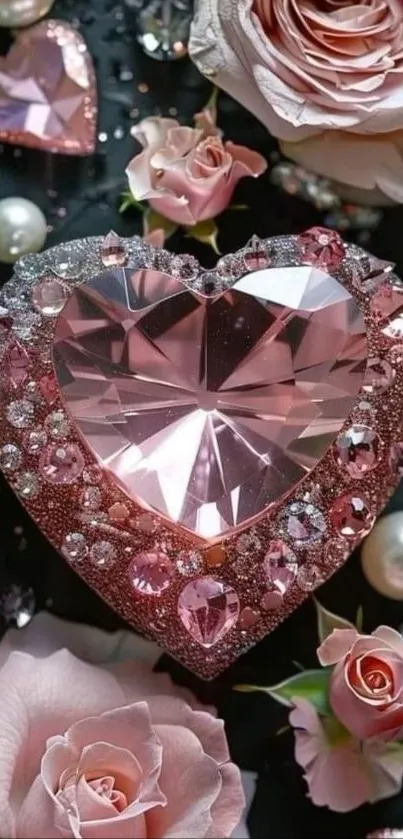 Enhance your phone with a sparkling pink gemstone heart, surrounded by elegant roses and pearls, ideal for a luxurious and romantic touch