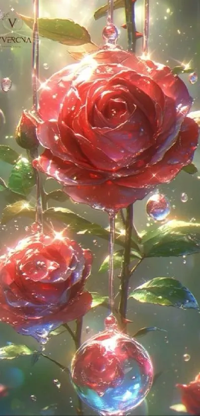 Download this enchanting mobile wallpaper featuring sparkling roses suspended in a surreal fantasy scene, perfect for adding a touch of elegance and magic to your device