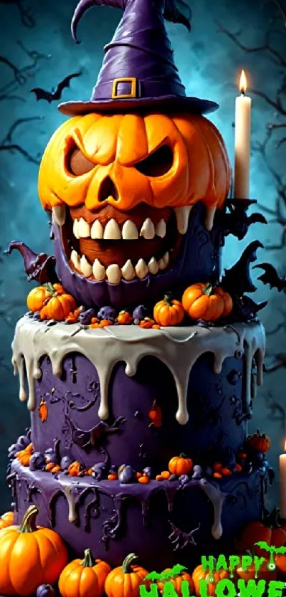 Celebrate Halloween with a spooky pumpkin cake adorned with a witch hat and eerie decorations, set against a mysterious night backdrop. Perfect for festive mobile wallpaper enthusiasts